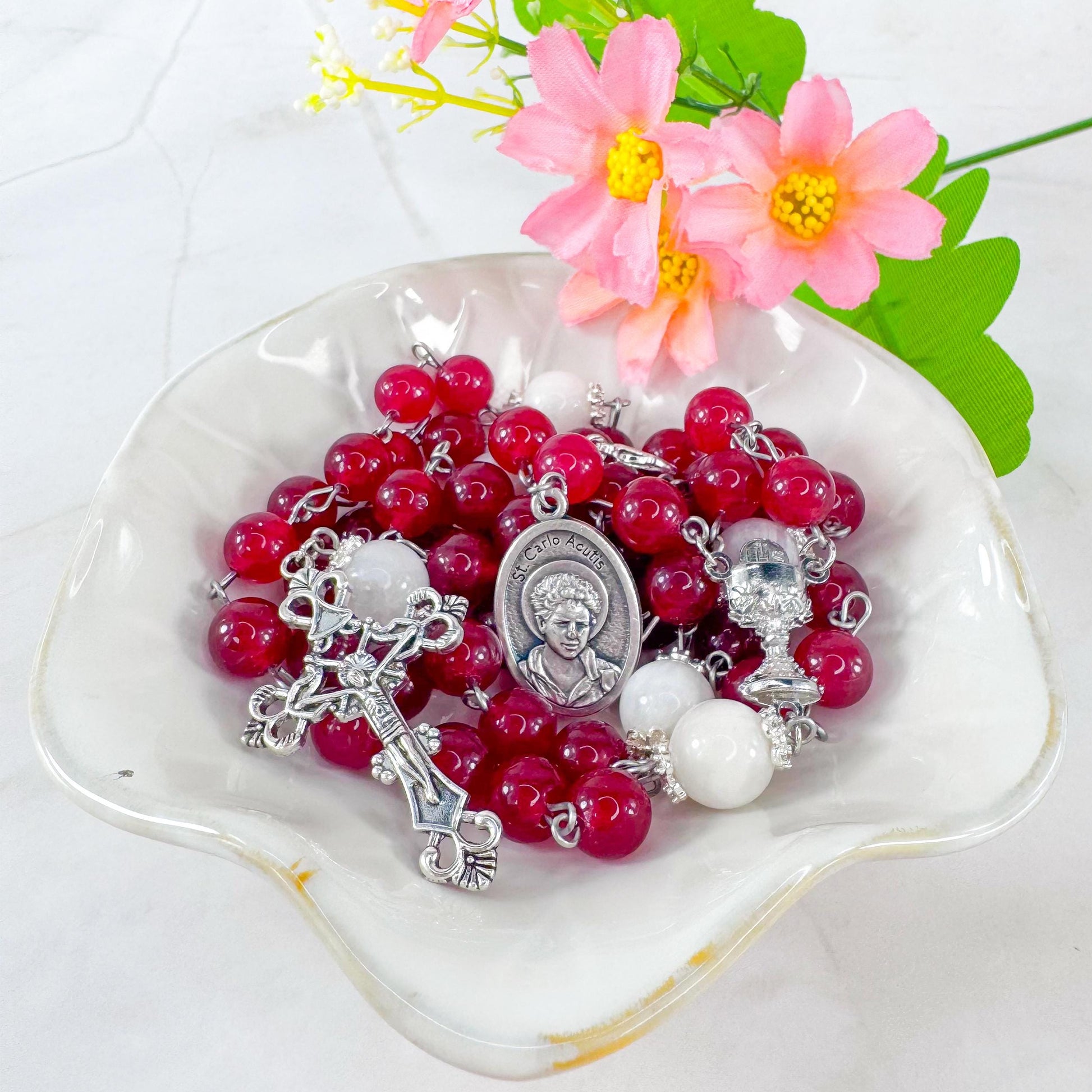 Crafted with deep red jasper beads for the Hail Marys and luminous white moonstone beads for the Our Fathers, this five-decade rosary is anchored by a silver-tone Eucharist centerpiece and an ornate crucifix. A silver Blessed Carlo Acutis medal hangs from a lobster clasp, allowing it to be used as a movable rosary marker or prayer focal.