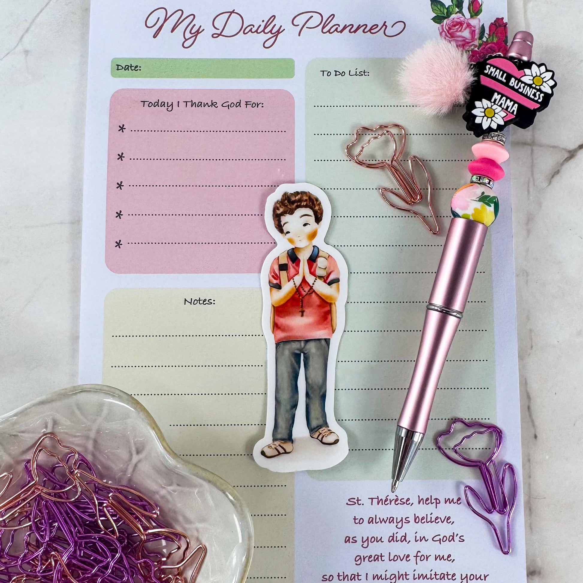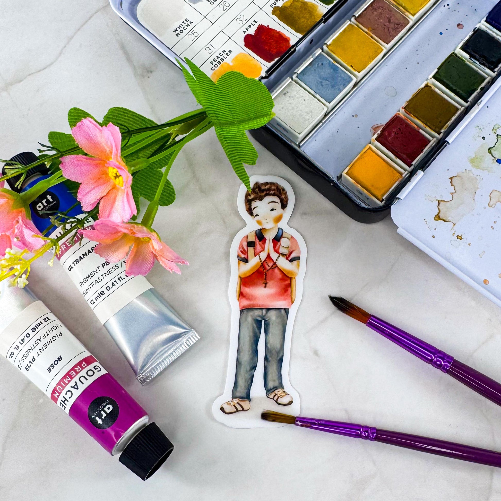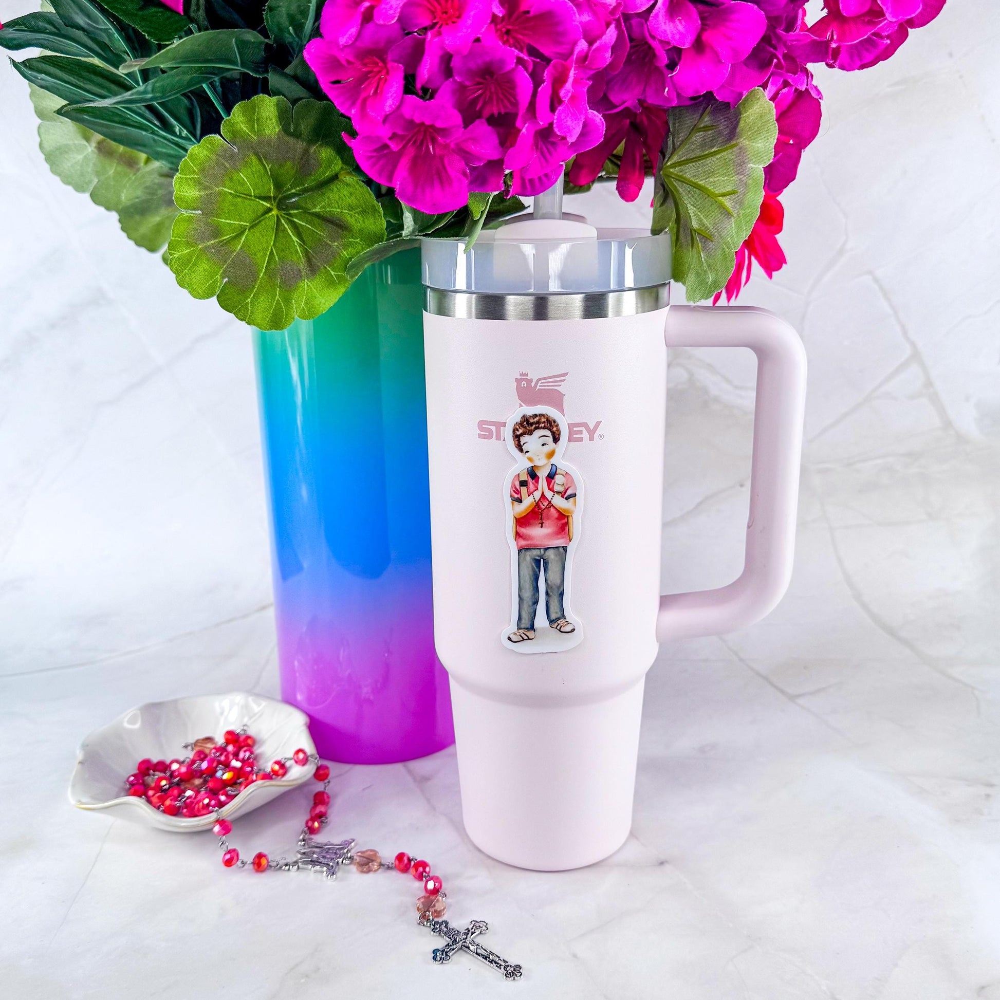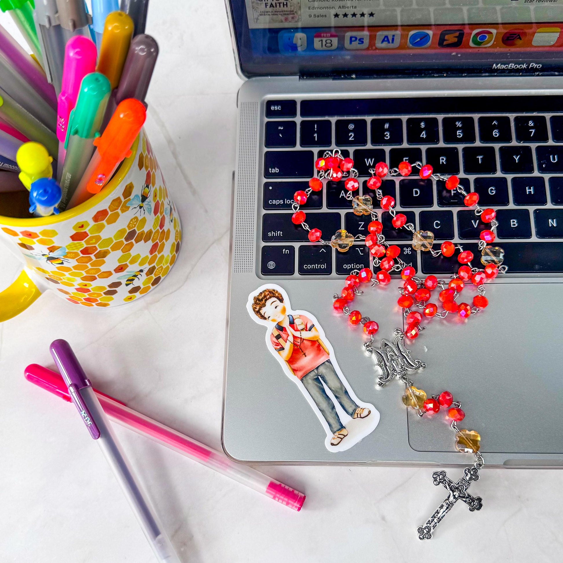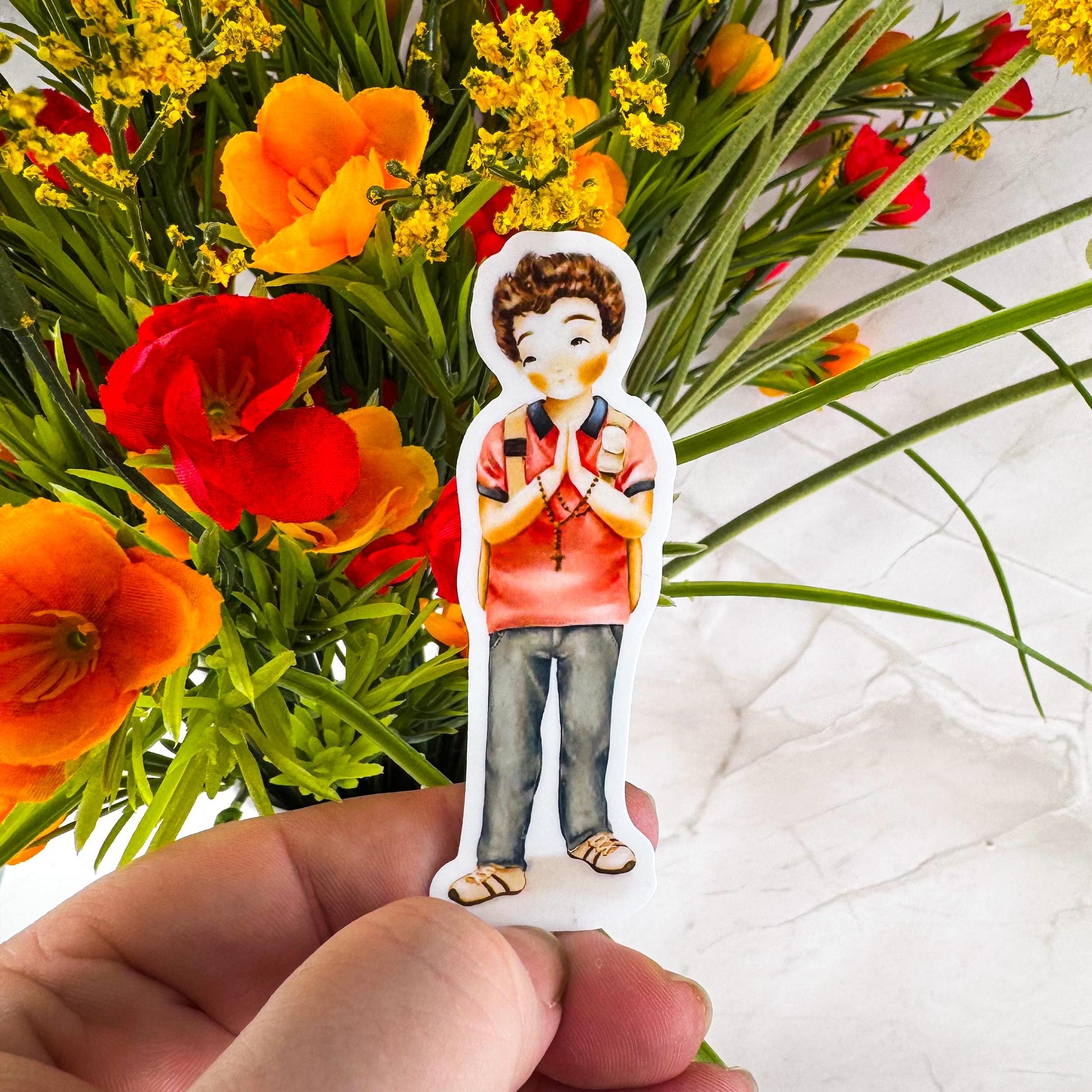 Bring faith and inspiration to your journal, planner, laptop, or water bottle with this hand-illustrated Blessed Carlo Acutis sticker. Created from original watercolor artwork — not clipart or AI — this design celebrates the young digital evangelist known for his deep love of the Eucharist and devotion to modern sainthood.