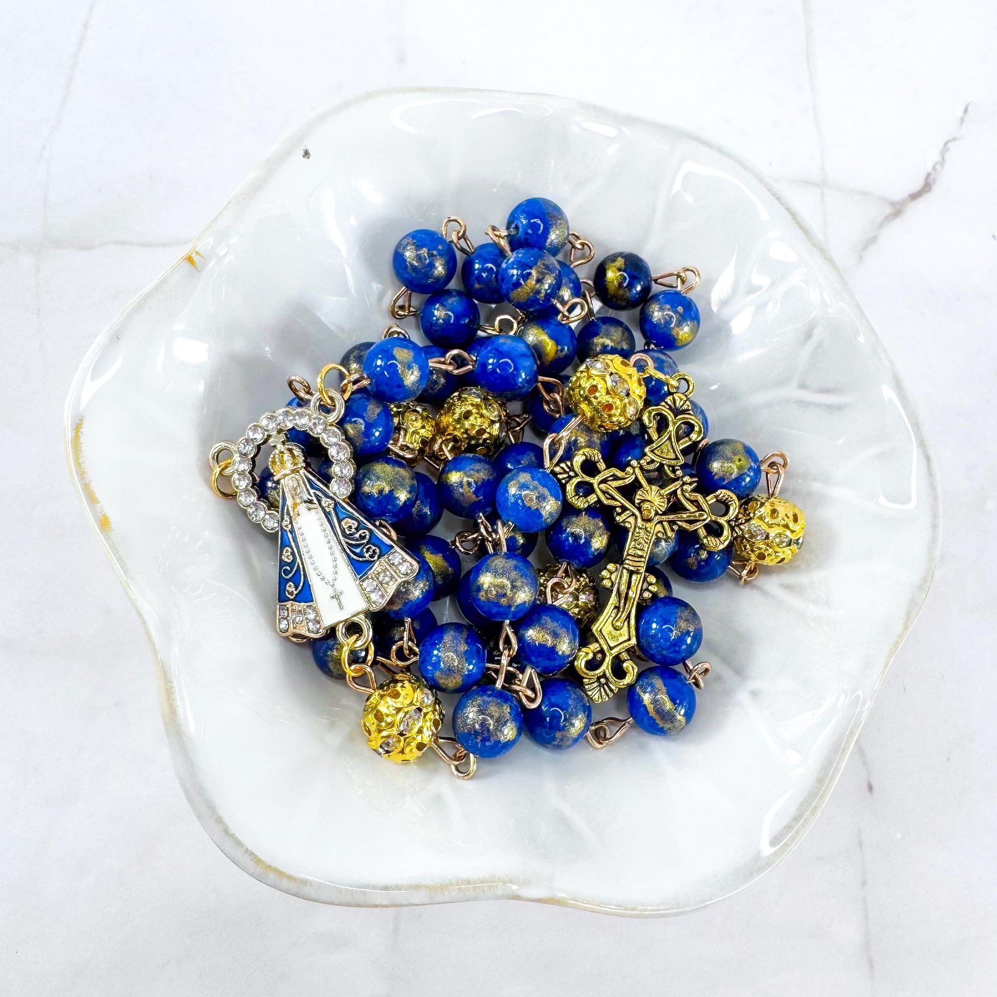 Crafted with deep royal blue lapis lazuli beads infused with natural golden flecks, this five-decade rosary is rich in both symbolism and beauty. The rosary features a sparkling enamel and rhinestone Our Lady of Aparecida centerpiece, gold rhinestone accent beads, and an ornate gold-tone crucifix.