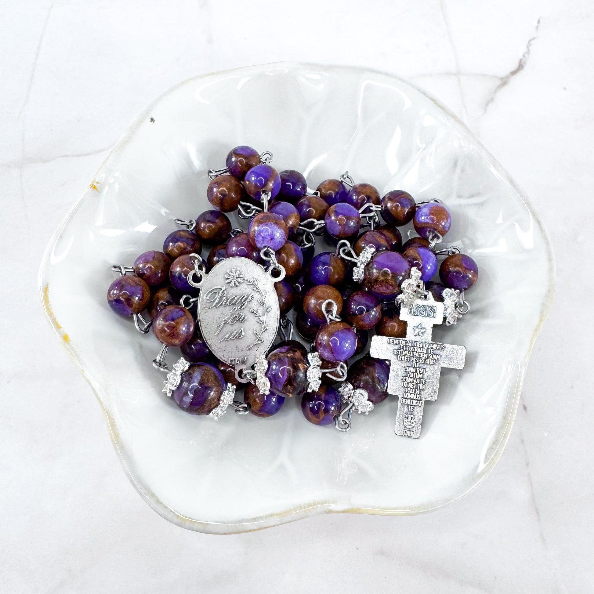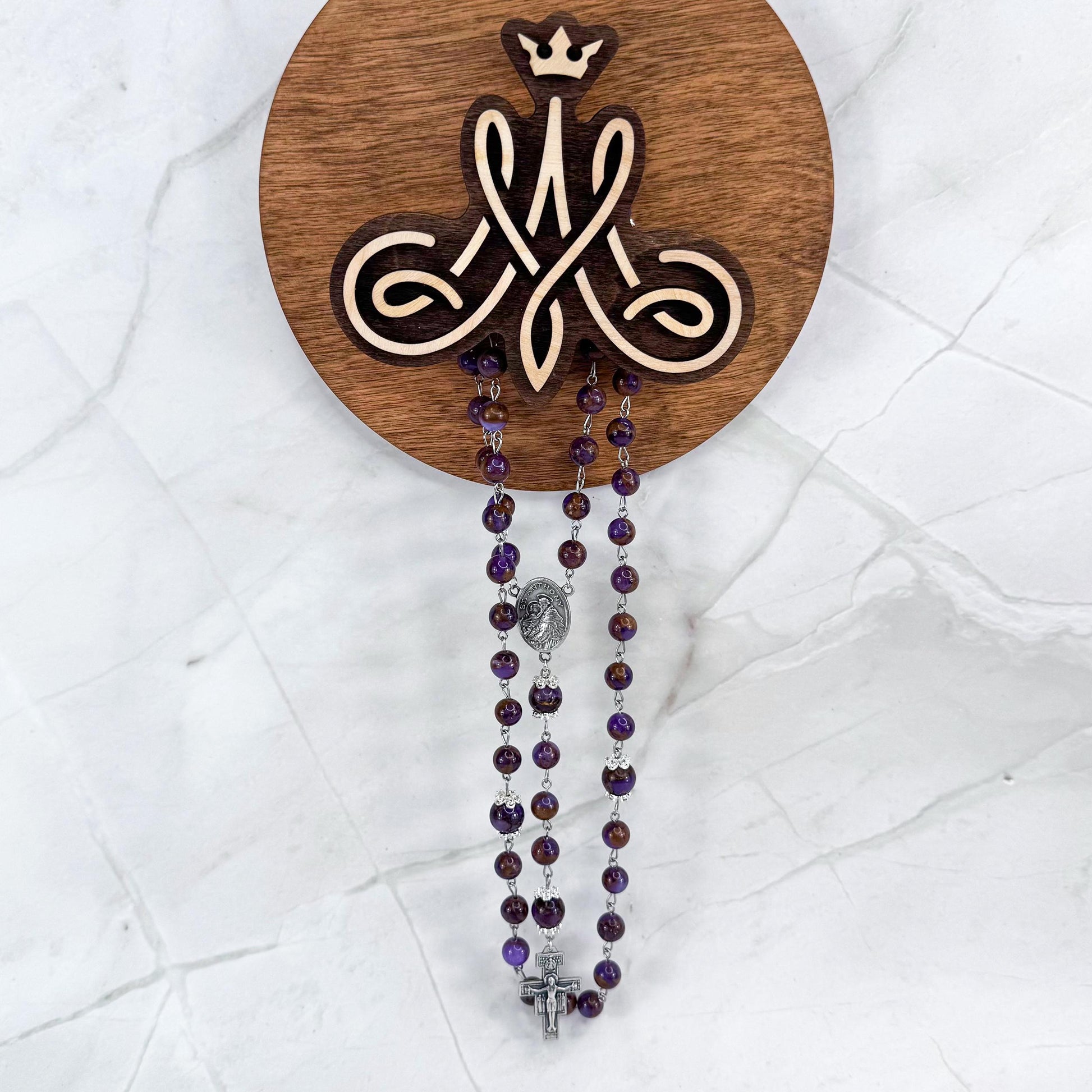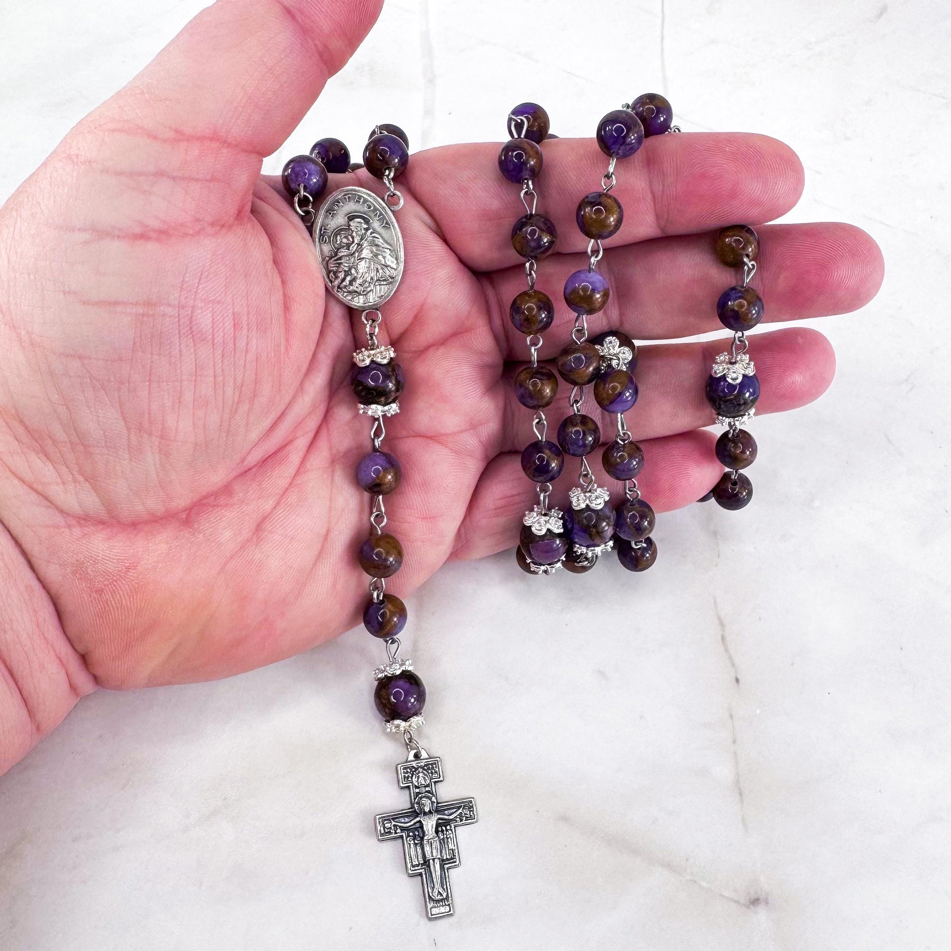 Crafted with elegant purple cloisonné gemstone beads, this five-decade rosary features silver-tone wire wrapping, a San Damiano crucifix, and a detailed Saint Anthony of Padua centerpiece medal. The soft lavender and violet hues offer a sense of calm and reverence, reflecting Saint Anthony’s deep love for Christ and powerful intercessory help.